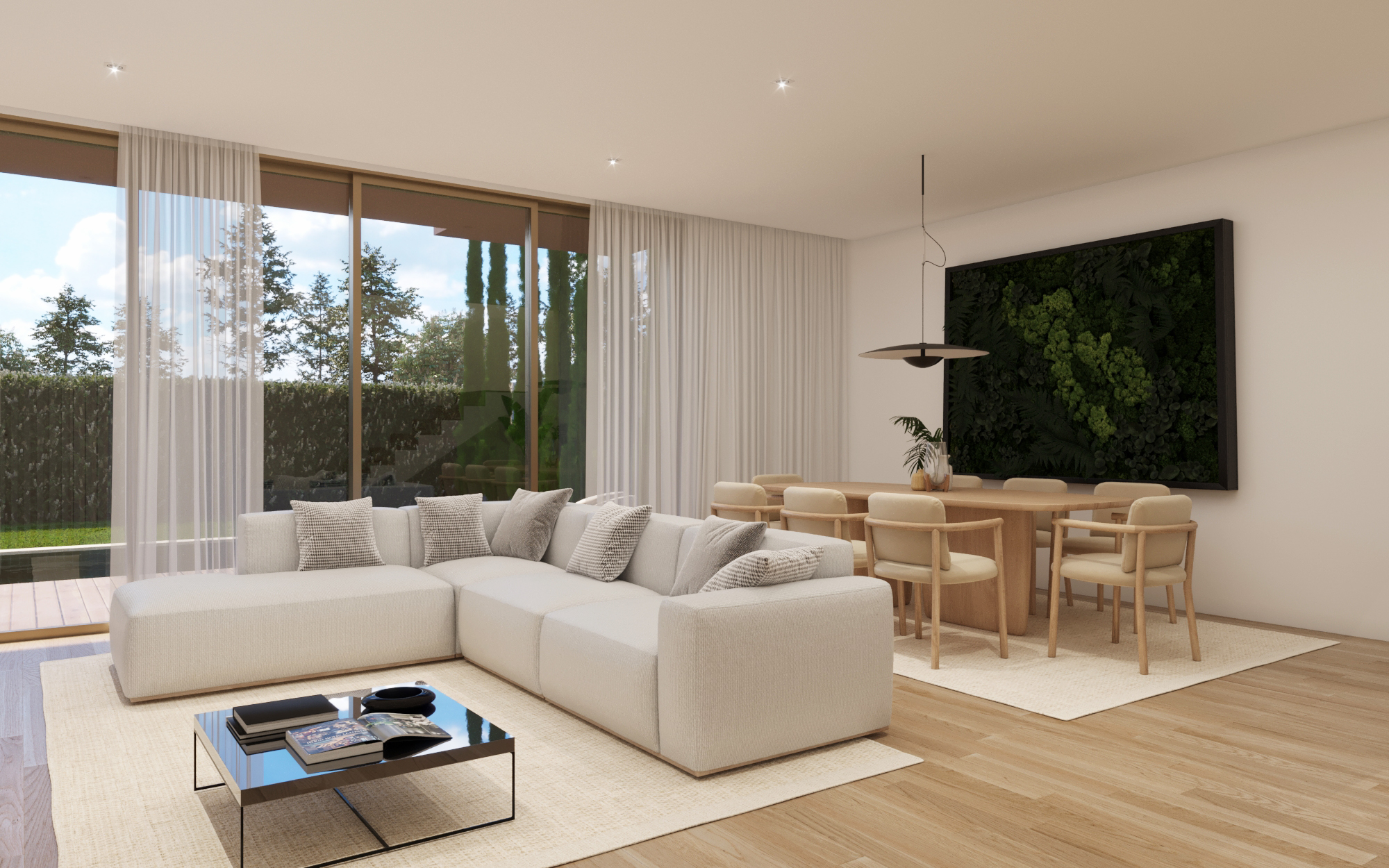 Os jardins privativos e as piscinas de cada moradia foram pensados como uma extensão natural dos espaços interiores, enquadrando-se harmoniosamente nos elevados padrões de acabamentos do projeto. Áreas exteriores cuidadosamente desenhadas proporcionam privacidade, conforto e bem-estar, criando o cenário ideal para momentos de lazer, convívio e descanso.